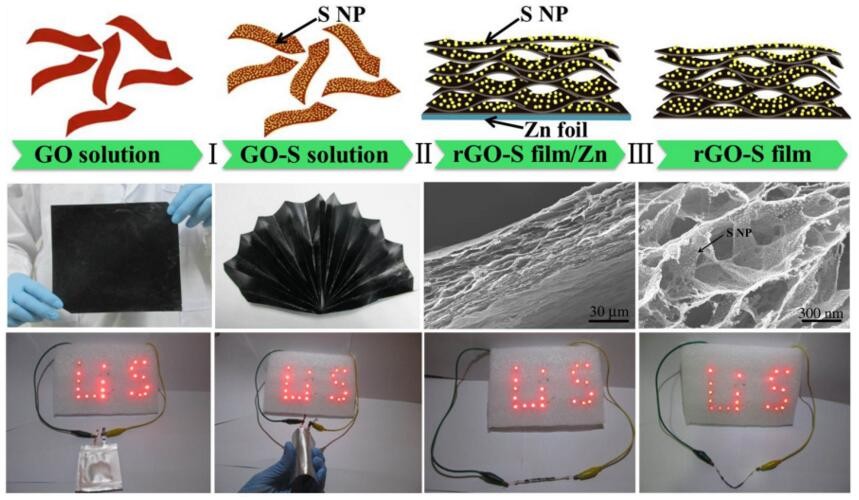 近期,南開大學(xué)牛志強(qiáng)研究團(tuán)隊(duì)結(jié)合原位復(fù)合和金屬還原自組裝的方法制備了自支撐柔性石墨烯/硫納米復(fù)合薄膜,復(fù)合物薄膜中石墨烯具有連續(xù)的網(wǎng)絡(luò)狀結(jié)構(gòu),硫均勻分散在石墨烯的表面,石墨烯連續(xù)的網(wǎng)絡(luò)狀結(jié)構(gòu)不僅為離子和電子傳輸提供了有效的途徑,還可以有效吸附多硫化物并抑制其溶解。