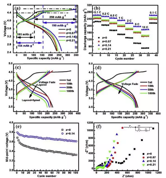 哈爾濱工業(yè)大學(xué)的Quanxin Ma等人針對富鋰材料這些問題進(jìn)行了摻雜改性實驗。Quanxin Ma通過向富鋰材料中加入Se元素合成了Li1.2[Mn0.7Ni0.2Co0.1]0.8_xSexO2,實驗表明該材料具有良好的倍率性能,在10C的倍率下,比容量可達(dá)178mAh/g,并且Se元素?fù)诫s很好的抑制了富鋰材料的電壓衰降,循環(huán)100次,中值電壓衰降僅為5%。