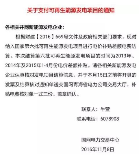 中國儲能網(wǎng)訊:11月8日,國家電力交易中心向青海新能源企業(yè)下發(fā)的《關于支付可再生能源發(fā)電項目的通知》(下稱“通知”)明確,計劃對納入國家第六批可再生能源發(fā)電項目進行電價補貼差額電費結算。同時《通知》要求,相關新能源企業(yè)在11月15日前將開具的發(fā)票及結算核對通知單送交青海國網(wǎng)交易大廳。