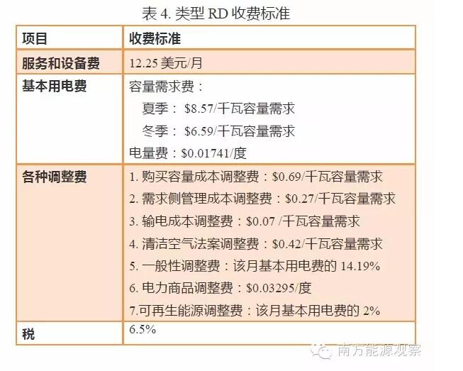 類型RD的電費(fèi)收取標(biāo)準(zhǔn)如表4所示。它也主要由三部分組成,不過與類型R相比有如下的不同:1)其每月的服務(wù)和設(shè)備費(fèi)要高;2)基本用電費(fèi)包括容量和電量兩部分。容量部分是基于用戶該月的容量需求(billing demand)來計(jì)算的。容量需求是基于用戶電表實(shí)時(shí)測量數(shù)據(jù)而得來,它等于該用戶在該月每15分鐘的平均用電需求的最大值。電量部分的價(jià)格要遠(yuǎn)低于類型R。3)調(diào)整費(fèi)當(dāng)中,前四項(xiàng)是基于容量需求而不是實(shí)際用電量來計(jì)價(jià)的。