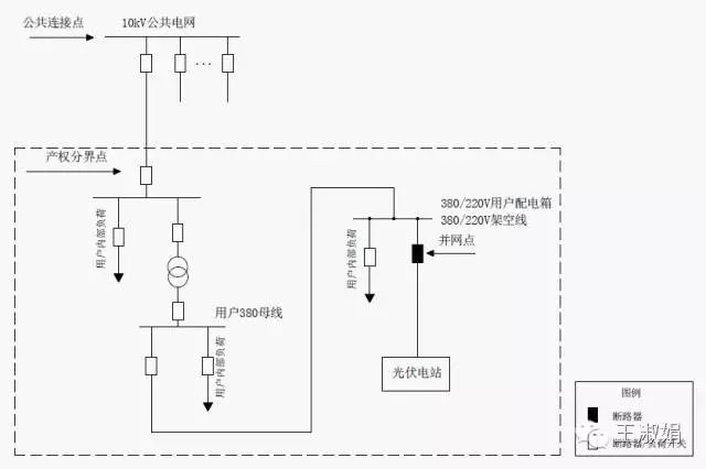 接入10kV的分布式光伏發(fā)電項目,形成雙重檢測和保護策略。380V電壓等級由逆變器實現(xiàn)防孤島檢測和保護功能,但在并網(wǎng)點應安裝易操作,具有明顯開斷指示的開斷設備。