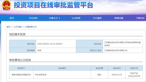 中國(guó)儲(chǔ)能網(wǎng)訊:11月15日,鳳凰汽車從國(guó)家發(fā)改委投資項(xiàng)目在線審批監(jiān)管平臺(tái)獲悉,江蘇敏安電動(dòng)汽車有限公司純電動(dòng)乘用車建設(shè)項(xiàng)目申請(qǐng)已通過審批,審批時(shí)間為11月15日,審批文號(hào):發(fā)改產(chǎn)業(yè)[2016]2407號(hào)。