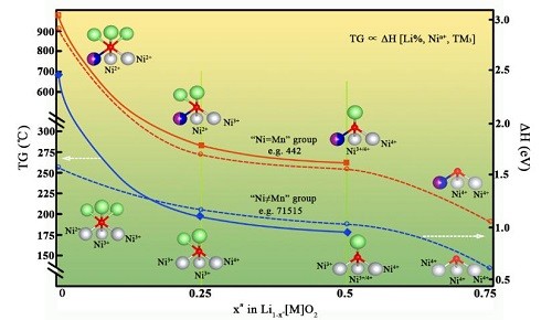 理論計(jì)算和實(shí)驗(yàn)測(cè)量得到三元層狀材料充電(脫鋰)過(guò)程中起始脫氧溫度的變化
