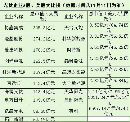 就是上表中所有在美上市企業(yè)加一起,總市值也只有36.31美元(約合246.9億元人民幣),也達不到一個隆基股份的274.2億元,更不要說協(xié)鑫集成的305.3億元。