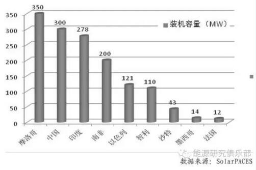 圖2各國(guó)在運(yùn)太陽能光熱發(fā)電站裝機(jī)容量
