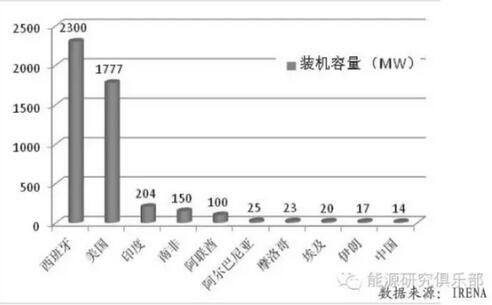 國(guó)際可再生能源署(IRENA)統(tǒng)計(jì)數(shù)據(jù)顯示,截至2015年12月底,西班牙在運(yùn)光熱電站總裝機(jī)容量為2300MW,占全球總裝機(jī)容量近一半,位居世界第一,美國(guó)第二,總裝機(jī)量為1777MW,兩者合計(jì)光熱裝機(jī)超過4吉瓦,約占全球光熱裝機(jī)的88%。其后是印度、南非、阿聯(lián)酋、阿爾及利亞、摩洛哥等國(guó)(見圖2)。中國(guó)截至2015年底已建成光熱裝機(jī)約14MW(與國(guó)內(nèi)統(tǒng)計(jì)數(shù)據(jù)略有出入),其中最大為青海中控德令哈50MW太陽能熱發(fā)電一期10MW光熱發(fā)電項(xiàng)目,其他項(xiàng)目多不足1MW,處于商業(yè)規(guī)?;那捌陔A段。
