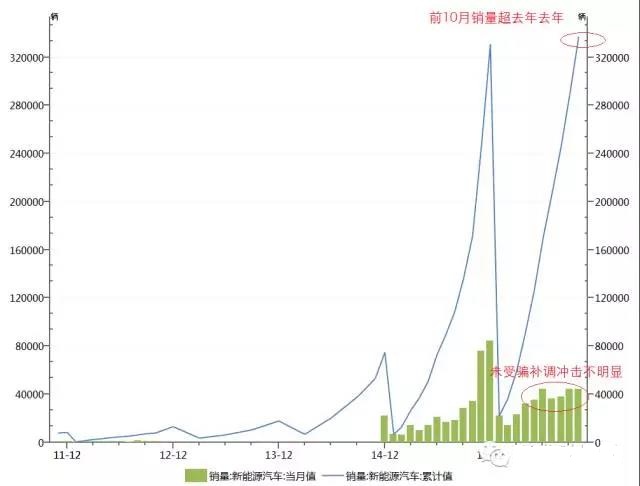 據(jù)中汽協(xié)數(shù)據(jù),截至10月份,中國新能源汽車累計銷量33.7萬輛,已超過去年全年的33.1萬輛。年初受騙補調(diào)查和季節(jié)性因素影響,新能源汽車在一季度銷售出現(xiàn)較大下滑,但隨后逐步企穩(wěn),尤其在9月騙補調(diào)查和處罰出臺后,銷量并未受到進一步?jīng)_擊。從產(chǎn)量看,累計產(chǎn)量為34.7萬輛,同比增長101%,同比增速在10月由80%左右提速到100%以上。2015年11月和12月為銷量大月,今年新能源汽車在最后兩月的表現(xiàn)值得期待。