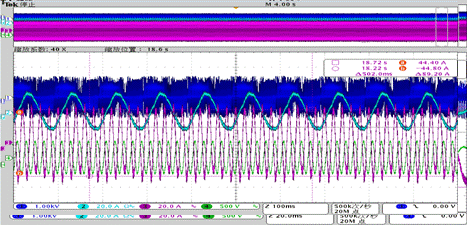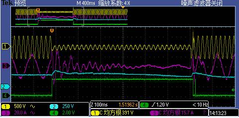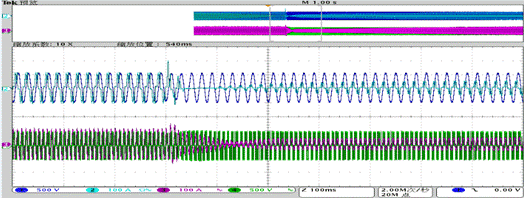 問題2:不同工況下,雙饋電機(jī)并網(wǎng)發(fā)電時,電流不穩(wěn),系統(tǒng)存在抖動,如下圖(1-轉(zhuǎn)子電壓,2-轉(zhuǎn)子電流,3-定子電流,4-定子電壓)
