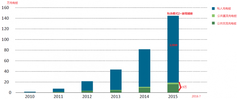 這里的數(shù)據(jù)是電動(dòng)車倡議(EVI)提供,IEA分析的,估計(jì)分析值全球電動(dòng)汽車保有量為126 萬輛完全一致,存在一些考慮。特別是評(píng)估2015年底,中國(guó)有25%的自有樁,31.5萬充電樁,明顯有些高估。