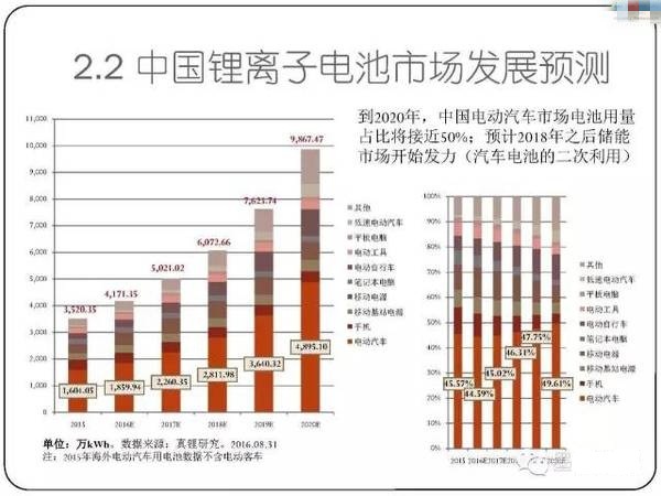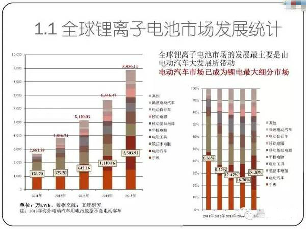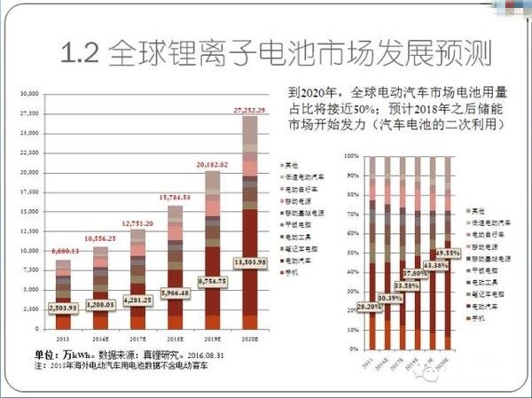 4)預(yù)計(jì)到2020年,全球電動(dòng)汽車(chē)市場(chǎng)對(duì)鋰離子電池的需求量將高達(dá)1.35億kWh,占到整個(gè)鋰電總需求的50%左右。鋰離子電池的未來(lái)在電動(dòng)汽車(chē)身上,這一點(diǎn)毋庸置疑。
