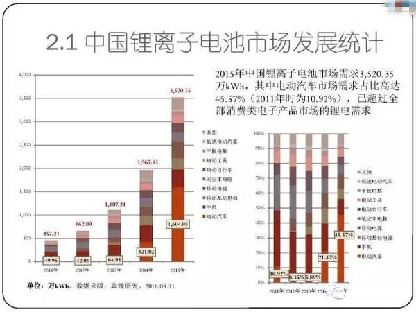 1)中國(guó)鋰離子電池市場(chǎng)發(fā)展速度明顯快于全球市場(chǎng),主要原因是2014年以來(lái)電動(dòng)汽車(chē)市場(chǎng)電池需求大爆發(fā),到2015年中國(guó)電動(dòng)汽車(chē)市場(chǎng)對(duì)鋰離子電池的需求量已經(jīng)高達(dá)1600萬(wàn)kWh,占比超過(guò)45%。