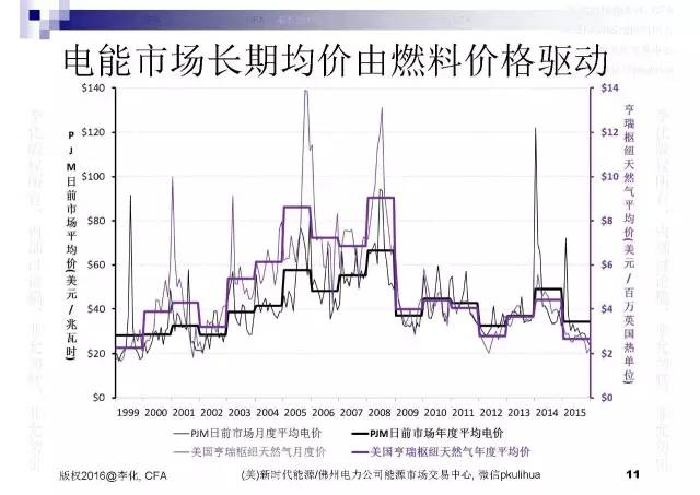 二是發(fā)電能源結(jié)構(gòu)、電力市場(chǎng)交易模式多樣化。美國(guó)發(fā)電能源形式多樣,主要有煤電、天然氣發(fā)電、核電、水電、風(fēng)電、太陽(yáng)能及其他可再生能源發(fā)電。歷史上,煤炭?jī)?chǔ)量豐富、成本較低,一直是美國(guó)電力供應(yīng)的第一來(lái)源,煤電裝機(jī)容量占比在40%-50%左右,但近年受益于美國(guó)頁(yè)巖氣的大規(guī)模開(kāi)采,天然氣價(jià)格大幅走低,天然氣發(fā)電的裝機(jī)容量已領(lǐng)先于煤電。