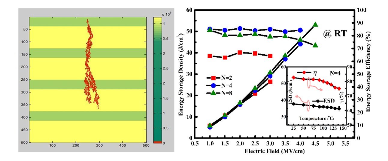近日,西安交通大學(xué)賈春林科學(xué)家工作室劉明副教授指導(dǎo)的博士生孫梓雄利用射頻磁控濺射技術(shù)制備出高質(zhì)量的Ba0.7Ca0.3TiO3/BaZr0.2Ti0.8O3(BCT/BZT) 多層復(fù)合薄膜并研究了其儲(chǔ)能性能。研究表明在多層膜總厚度一致的情況下,通過(guò)增加周期數(shù)(BCT相與BZT相之間的界面數(shù))可以有效地提高該薄膜材料的儲(chǔ)能密度。同時(shí),通過(guò)計(jì)算機(jī)仿真模擬揭示界面數(shù)的增加可以有效地阻礙電流樹枝的發(fā)展,從而通過(guò)提高樣品擊穿場(chǎng)強(qiáng)來(lái)達(dá)到材料儲(chǔ)能密度的提高。此類多層薄膜材料不僅表現(xiàn)出優(yōu)異的室溫儲(chǔ)能特性,同時(shí)在140oC下依然保持較高的儲(chǔ)能密度和儲(chǔ)能效率。這將有可能實(shí)現(xiàn)混合動(dòng)力汽車前級(jí)水冷系統(tǒng)的摘除,大大降低生產(chǎn)成本和提高機(jī)電系統(tǒng)的微型化。同時(shí),該項(xiàng)研究結(jié)果將對(duì)尋求更高儲(chǔ)能密度提供重要的實(shí)驗(yàn)途徑和理論依據(jù)。