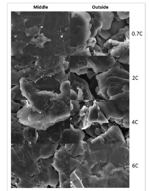 通過拆解循環(huán)后的電池,隨著充電速率的增加,負極的顏色也發(fā)生了改變,在0.7C和2C的充電倍率下,電極呈現(xiàn)了均一的顏色,而到充電倍率提高到4C,電極的中間位置呈現(xiàn)出了灰色,而在6C的倍率下,不但中間部分的電極呈現(xiàn)除灰色,中間部分的活性物質(zhì)還出現(xiàn)了脫落的現(xiàn)象。SEM掃描發(fā)現(xiàn),在0.7C和2C的倍率下,電極表面呈現(xiàn)除原始的狀態(tài),但是在4C的倍率下,電極表面開始出現(xiàn)一些亮點,6C的倍率下,電極的表面狀態(tài)則明顯不同了,由于SEI膜厚度的增加,已經(jīng)難以分辨單獨的石墨顆粒了。