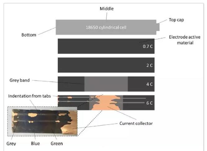 實驗中L. Somerville采用了商業(yè)的NMC/石墨18650電池,以盡可能還原商用鋰離子電池中石墨負極的工作狀態(tài)。充電速率被設(shè)定為0.7,2,4,6C,放電速率為C/3,電池溫度控制在25℃。