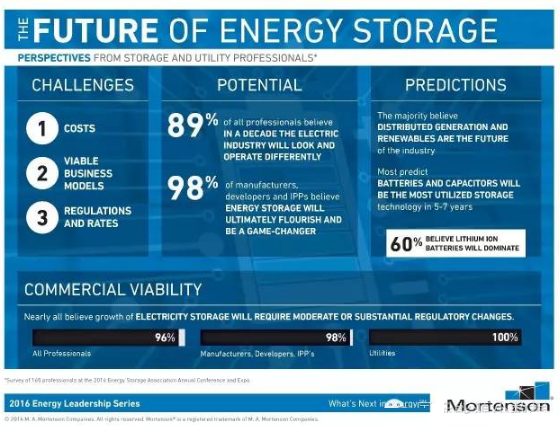 中國(guó)儲(chǔ)能網(wǎng)訊:美國(guó)知名的能源基礎(chǔ)設(shè)施建設(shè)承包公司Mortenson最近發(fā)布了一份調(diào)查報(bào)告,采訪了165位能源界專業(yè)人士,對(duì)儲(chǔ)能技術(shù)面臨的挑戰(zhàn)、潛力和未來(lái)進(jìn)行了評(píng)估。