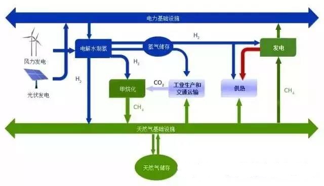 電解制氫后,將氫氣直接混入天然氣管道,或者合成甲烷后混入天然氣管道;混合天然氣在終端作為燃料提供熱能。