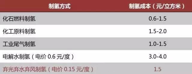 目前棄光、棄風和棄水發(fā)電的成本價格為0.15元/度,據(jù)此計算出的電解水制氫成本為1.5元/立方米,這已經(jīng)遠低于利用上網(wǎng)電電解水制氫的成本,且與化石燃料(煤、焦炭和天然氣)制氫的成本上限接近(表1)。