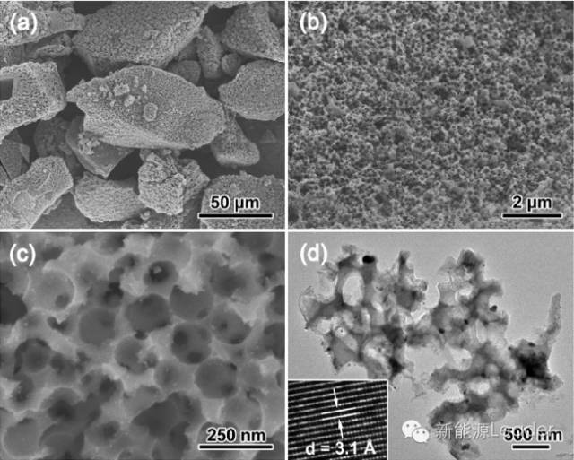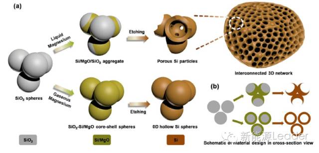 制備過(guò)程如下,首先將直徑在200nm左右的SiO2顆粒與Mg粉進(jìn)行混合,然后放入管式爐中,在Ar氣的保護(hù)下,700℃焙燒5h,獲得產(chǎn)物在鹽酸中攪拌6小時(shí),清除沒有反應(yīng)的MgO。剩余的粉末在HF溶液中反應(yīng)12h,清除掉沒有反應(yīng)的SiO2,就獲得了具有3D大孔的硅負(fù)極材料,只要對(duì)上述的焙燒條件稍作改變就可以獲得0D的中空Si納米球。上述獲得材料利用CVD方法在其表面包覆了一層石墨。SEM顯示,經(jīng)過(guò)上述反應(yīng)過(guò)程,Si已經(jīng)轉(zhuǎn)變成為了一個(gè)具有多孔結(jié)構(gòu)的大框架。