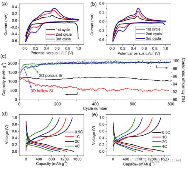 近日,浙江大大學(xué)的Hao Wu利用鎂熱反應(yīng)的方法合成了具有3D結(jié)構(gòu)的大孔硅負(fù)極材料,在電池充放電過(guò)程中,這種相互連接的孔結(jié)構(gòu)能夠很好的吸收Si負(fù)極的膨脹,從而大幅提高了Si負(fù)極的循環(huán)性能,在循環(huán)800次后仍然具有1058mAh/g的容量,容量保持率為91%,循環(huán)過(guò)程中的庫(kù)倫效率達(dá)到99.4%。Hao Wu還通過(guò)控制反應(yīng)條件,用同樣的前驅(qū)體和同樣的方法合成0D的中空Si納米球。