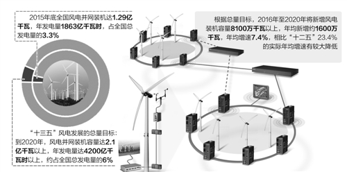 “十二五”時(shí)期我國(guó)提出,到2015年風(fēng)電并網(wǎng)裝機(jī)容量達(dá)1.04億千瓦,年發(fā)電量達(dá)1900億千瓦時(shí),占全國(guó)總發(fā)電量比重超過(guò)3%。實(shí)際上,到2015年底全國(guó)風(fēng)電并網(wǎng)裝機(jī)已達(dá)1.29億千瓦,年發(fā)電量1863億千瓦時(shí),占全國(guó)總發(fā)電量的3.3%,與規(guī)劃高度契合。