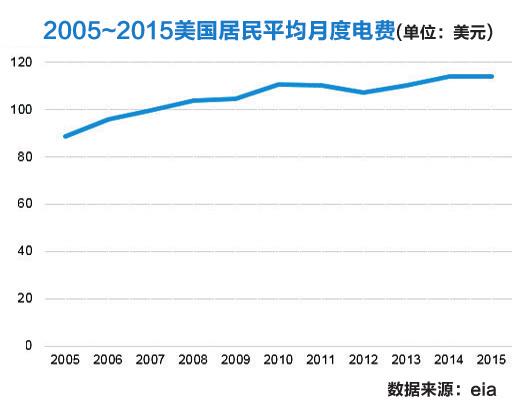 總體來看,2013年至2014年間,美國居民平均月度電費持續(xù)攀升,2015年輕微下滑。