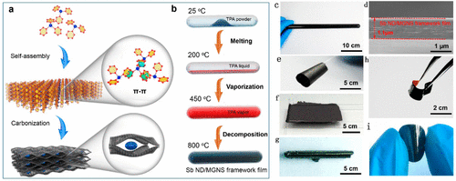 圖1 限域超組裝氣相沉積法中金屬-碳骨架復(fù)合膜形成機(jī)制:(a)和合成路線(b);復(fù)合膜掃描電鏡照片(d)及石英管中復(fù)合膜(c)和復(fù)合膜在不同彎曲和加工處理時(shí)的光學(xué)照片(e-i)