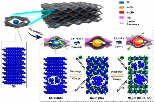 圖2 Sb-C骨架復(fù)合膜電極在充放電循環(huán)過程中可能的可逆晶態(tài)相變機(jī)理