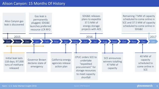 GTM曾報(bào)道過(guò)阿利索峽谷天然氣泄漏事件對(duì)加州儲(chǔ)能需求的快速增加以及峰值容量的影響。Kann將事件及其后續(xù)的時(shí)間線梳理出來(lái),并特別提到,從2015年10月事件發(fā)生,到2017年1月美國(guó)公用事業(yè)南加州愛(ài)迪生公司(SCE)和圣地亞哥天然氣與電力公司(SDG&E)將合計(jì)上線84.5MW的儲(chǔ)能,整個(gè)過(guò)程只用了15個(gè)月。