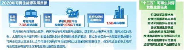 到2020年,各類可再生能源供熱和民用燃料總計可替代化石能源約1.5億噸標準煤,一些地區(qū)工業(yè)、建筑、交通等領(lǐng)域增量或存量的能源消費中將爭取率先實現(xiàn)高比例可再生能源應用,并形成以可再生能源為主、分布式電源多元互補的較為完善的新能源微電網(wǎng)技術(shù)體系和管理體制,為加快推動可再生能源利用、替代化石能源消費打下堅實基礎。