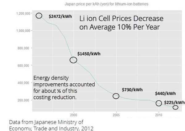 中國儲能網(wǎng)訊:根據(jù)日本經(jīng)濟產(chǎn)業(yè)省的數(shù)據(jù),鋰電池的成本在過去20年里每年平均下降10%。從上個世紀90年代中的2472美元/千瓦時降至2010年的440美元/千瓦時,目前成本降至200-300美元/千瓦時。那么,有沒有可能鋰電池的成本在較短的時間降至100美元/千瓦時?如果達到這個水平,能源世界勢將面臨新的革命。