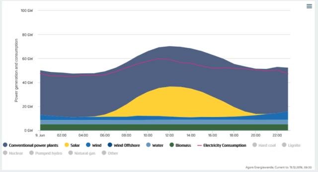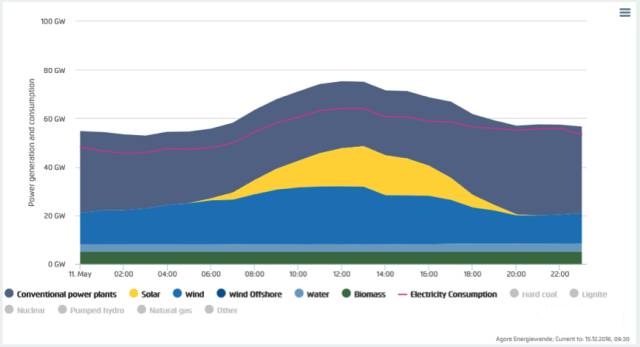 這天也是個(gè)公休日,負(fù)荷較低,而風(fēng)光都出力很好。曾有多個(gè)媒體報(bào)道:“2014年5月11日,這一天的中午時(shí)分,德國(guó)的光伏、風(fēng)電出力高達(dá)當(dāng)時(shí)負(fù)荷的74%”。經(jīng)多方核實(shí),這個(gè)數(shù)據(jù)有問題。