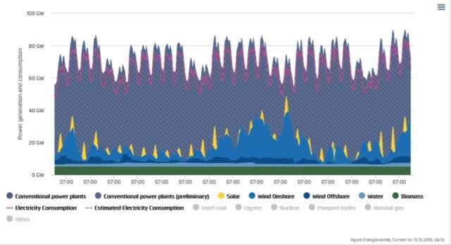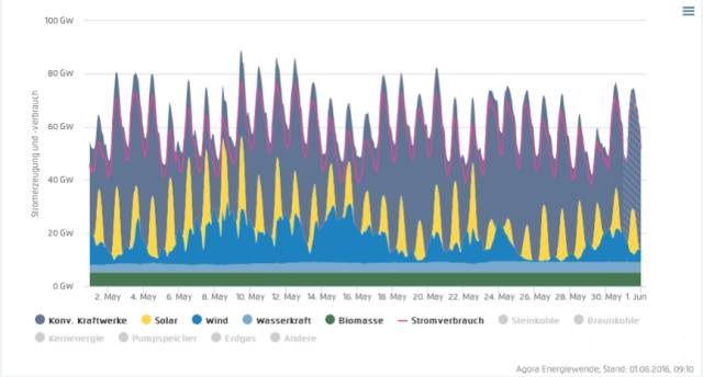 這天是個(gè)星期天,用電負(fù)荷低于工作日,風(fēng)電光伏都大發(fā),創(chuàng)造了記錄。這天的數(shù)據(jù)我此前做過一次計(jì)算,但錯(cuò)誤地計(jì)算成了88%,特此向讀者們致歉。德國(guó)2016年1-5月可再生能源發(fā)電情況.最高時(shí)段88%。