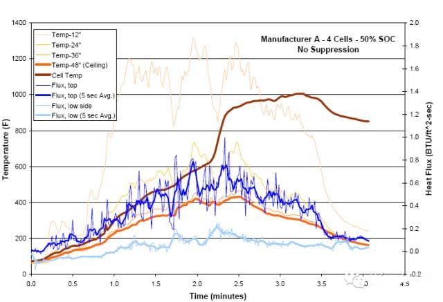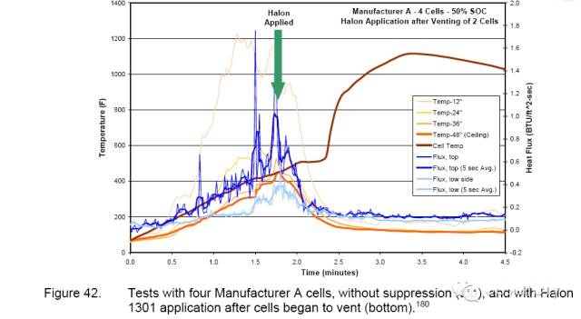 2006年,美國(guó)聯(lián)邦航空局50 18650上的鋰離子電池進(jìn)行哈龍1301的抑制類似的測(cè)試,100%SOC. 聯(lián)邦航空局觀察到類似的行為來(lái)測(cè)試通過指數(shù)報(bào)告的結(jié)果。