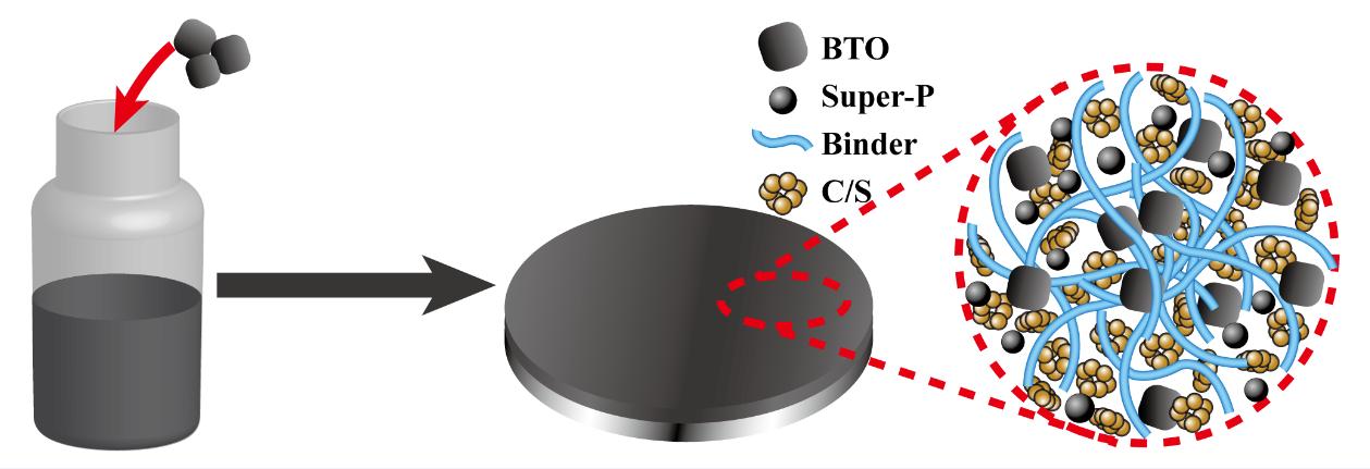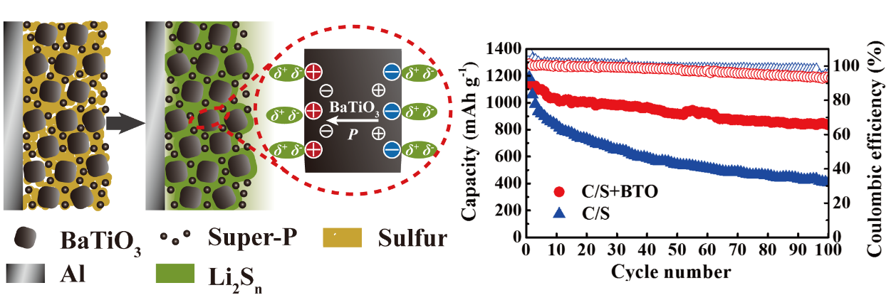 鋰硫電池理論能量密度高達(dá)2600 Wh kg-1,是未來最具應(yīng)用前景的新型二次電池之一。但其充放電過程中的中間產(chǎn)物在電解液中具有一定的溶解性,易擴(kuò)散到負(fù)極,并與鋰金屬反應(yīng),造成正極活性物質(zhì)損失,并腐蝕鋰負(fù)極,嚴(yán)重影響了電池的循環(huán)穩(wěn)定性,成為制約其商業(yè)化應(yīng)用最關(guān)鍵問題。該工作借鑒了鐵電材料與光催化領(lǐng)域的最新研究進(jìn)展,簡單地將鐵電材料BaTiO3作為添加劑加入到正極漿料之中,利用納米BaTiO3自發(fā)極化特性吸附同樣為極性的中間產(chǎn)物,顯著提升鋰硫電池的循環(huán)穩(wěn)定性。比其他思路,該方法操作簡單,可無縫銜接到目前鋰電池電極制造工藝之中,適合工業(yè)化生產(chǎn)。