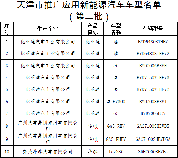 附件:天津市推廣應(yīng)用新能源汽車(chē)車(chē)型名單(第二批)