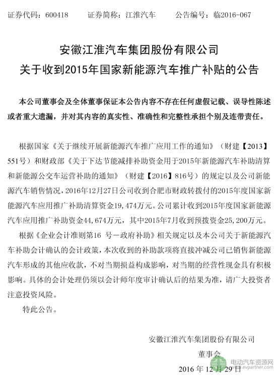 中國儲能網(wǎng)訊:江淮汽車12月29日晚間發(fā)布公告,2016年12月27日,江淮汽車收到合肥市財政轉(zhuǎn)撥付的2015年度國家新能源汽車應(yīng)用推廣補助清算資金19,474萬元,累計收到2015年度國家新能源汽車推廣補助資金44,674萬元,其中2015年7月收到預(yù)撥資金25,200萬元。
