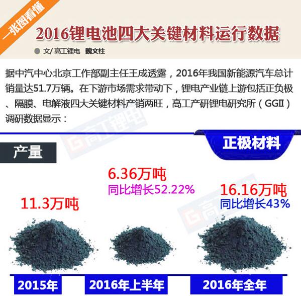 中國儲能網(wǎng)訊:據(jù)中汽中心北京工作部副主任王成透露,2016年我國新能源汽車總計銷量達51.7萬輛。在下游市場需求帶動下,鋰電產(chǎn)業(yè)鏈上游包括正負極、隔膜、電解液四大關(guān)鍵電池材料產(chǎn)銷兩旺。