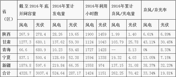 2016年,西北五省(區(qū))新增光伏發(fā)電并網(wǎng)容量1011萬千瓦,截至2016年年底,累計(jì)并網(wǎng)容量3037萬千瓦,占全網(wǎng)總裝機(jī)的13.8%。2016年,光伏發(fā)電量287.17億千瓦時(shí),占全網(wǎng)總發(fā)電量的4.57%;利用小時(shí)數(shù)1151小時(shí),棄光電量70.42億千瓦時(shí),棄光率19.81%。西北五省(區(qū))中,新疆、甘肅光伏發(fā)電運(yùn)行較為困難,棄光率為32.23%和30.45%。此外,寧夏棄光率7.15%,青海棄光率8.33%,陜西首次發(fā)生棄光限電情況,棄光率為6.89%。