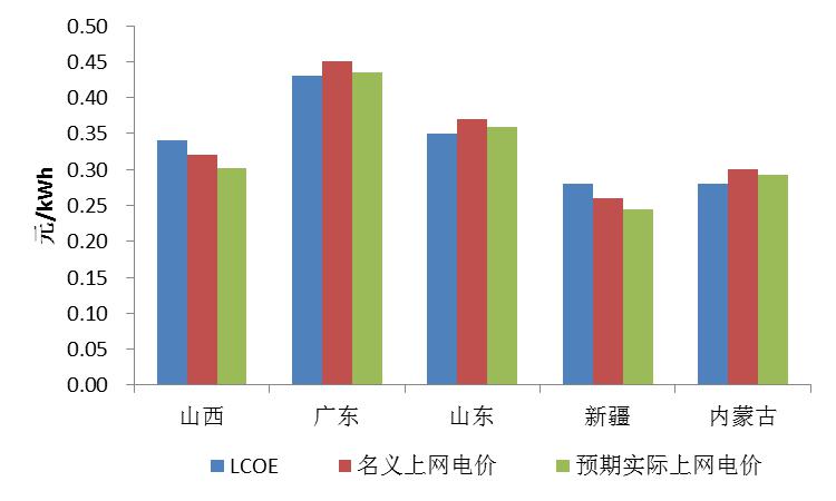 圖6. 2017年典型省LCOE與上網(wǎng)電價(jià)對比