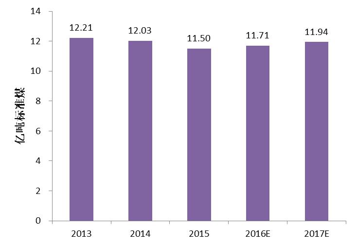 就發(fā)電耗煤量而言,2013年達(dá)到了12.21億噸標(biāo)準(zhǔn)煤,此后2014、2015年由于煤電發(fā)電量下降而連續(xù)兩年降低。根據(jù)2016年、2017年的煤電發(fā)電量和發(fā)電煤耗率的走勢,我們預(yù)計(jì)2016、2017年發(fā)電耗煤量有小幅回升,2017年預(yù)計(jì)達(dá)到11.94億噸標(biāo)準(zhǔn)煤,仍未回升到2013年的水平。