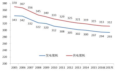 2014年來國家能源主管與環(huán)境管理部門陸續(xù)發(fā)布了煤電節(jié)能減排改造政策、計(jì)劃與推進(jìn)政策,體現(xiàn)了煤電行業(yè)能效提升的發(fā)展目標(biāo)與方向,同時(shí)也反映了主管部門對于煤電機(jī)組節(jié)能減排改造的決心與態(tài)度。根據(jù)中國電力企業(yè)聯(lián)合會(huì)公布的數(shù)據(jù),截至2016年11月全國煤電機(jī)組平均供電煤耗為313gce/kWh,在2015年的基礎(chǔ)上進(jìn)一步下降了2gce/kWh。我們預(yù)計(jì)2017年供電煤耗會(huì)進(jìn)一步降低到312 gce/kWh。