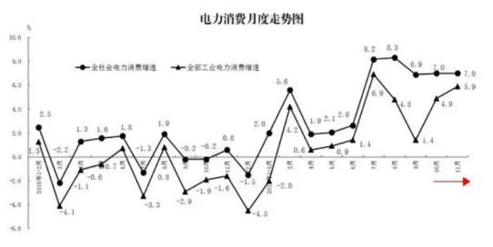 分產(chǎn)業(yè)看,1-11月份,第一產(chǎn)業(yè)用電量1002億千瓦時(shí),同比增長5.2%,占全社會(huì)用電量的比重為1.9%;第二產(chǎn)業(yè)用電量38119億千瓦時(shí),同比增長2.6%,增速比上年同期提高3.7個(gè)百分點(diǎn),占全社會(huì)用電量的比重為70.8%;第三產(chǎn)業(yè)用電量7286億千瓦時(shí),同比增長11.7%,增速比上年同期提高4.4個(gè)百分點(diǎn),占全社會(huì)用電量的比重為13.5%;城鄉(xiāng)居民生活用電量7441億千瓦時(shí),同比增長11.4%,增速比上年同期提高6.7個(gè)百分點(diǎn),占全社會(huì)用電量的比重為13.8%。