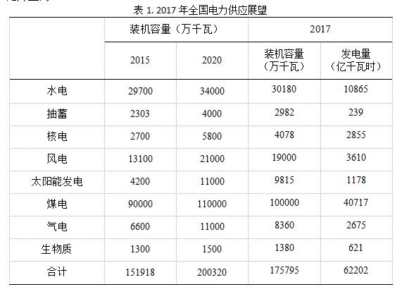 展望2017年電力供應(yīng)形勢,重點(diǎn)是各類電源的投產(chǎn)新增情況。其中,由于水電和核電建設(shè)周期長,新增供應(yīng)能力較為明確。據(jù)相關(guān)項(xiàng)目資料統(tǒng)計(jì),預(yù)計(jì)2016-2017年水電將新增發(fā)電能力480萬千瓦,核電將新增發(fā)電能力1378萬千瓦;到2017年,我國水電裝機(jī)規(guī)模將達(dá)到3.02億千瓦,核電裝機(jī)規(guī)模將達(dá)到4078萬千瓦。另據(jù)有關(guān)分析,2017年預(yù)計(jì)新增風(fēng)電并網(wǎng)裝機(jī)容量2000萬千瓦、新增光伏發(fā)電并網(wǎng)裝機(jī)容量1800萬千瓦。由此可得2017年全國電力供應(yīng)能力展望(表1)。