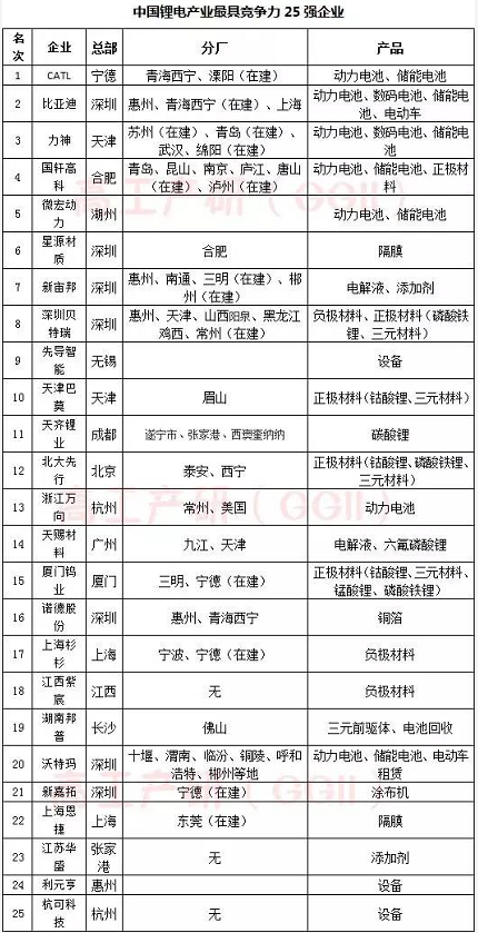 高工產(chǎn)研鋰電研究所(GGII)通過(guò)對(duì)鋰電上下游的深入溝通和觀察,評(píng)選出鋰電產(chǎn)業(yè)鏈最具競(jìng)爭(zhēng)力的25家企業(yè),評(píng)選維度主要有行業(yè)貢獻(xiàn)值、專(zhuān)利水平、研發(fā)團(tuán)隊(duì)、所處環(huán)節(jié)的行業(yè)地位、產(chǎn)值等。