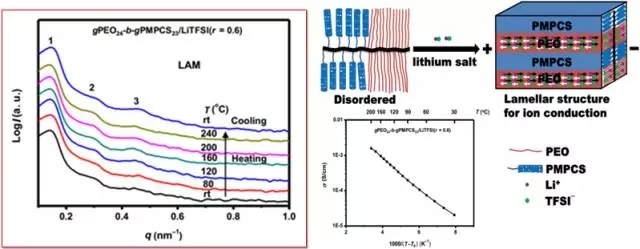 研究結(jié)果表明,采用含剛性側(cè)鏈的雙親性嵌段共聚聚合物刷的鋰鹽復合體系,制備的離子電池的鋰離子傳導率隨著溫度的增加而增加,在200℃時的離子傳導率為1.58×10-3S/cm,達到了目前文獻報道的含PEO的固態(tài)聚電解質(zhì)離子傳導率最高水平,有希可應用于高溫鋰離子電池中的固態(tài)聚電解質(zhì)。該研究成果具有巨大的產(chǎn)業(yè)化前景,并有望改變現(xiàn)有鋰離子電池產(chǎn)業(yè)格局。