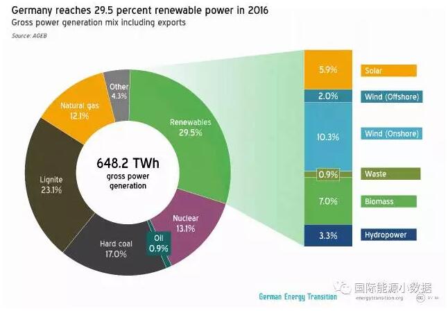 2016年德國發(fā)電量達(dá)到6482億千瓦時,其中煤電占40.1%,天然氣發(fā)電占12.1%,核電占13.1%,各類可再生能源發(fā)電占29.5%(風(fēng)電12.3%,生物質(zhì)及垃圾發(fā)電7.9%,太陽能發(fā)電5.9%,水電3.3%),其他燃料發(fā)電占5.2%。也就是說,目前化石能源發(fā)電占比達(dá)到53%。