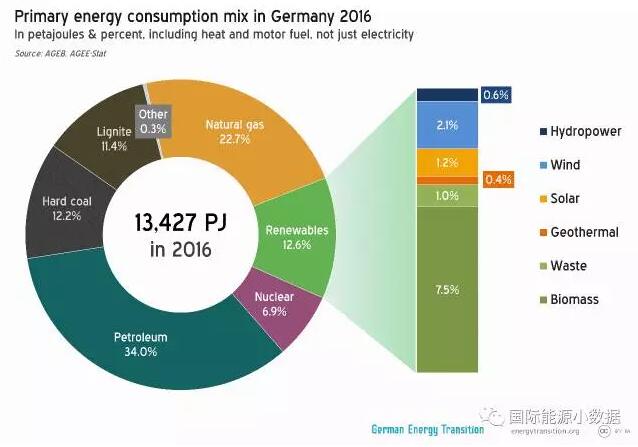2016年德國一次能源消費總量為13,427PJ(約3.21億噸標(biāo)準(zhǔn)油),其中石油占34.0%,煤炭占23.6%,天然氣占22.7%,核能占6.9%,其他可再生能源合計占12.6%(生物質(zhì)及垃圾8.5%,風(fēng)能2.1%,太陽能1.2%,水電0.6%,地?zé)?.4%)。由此可見,目前化石能源仍占德國一次能源消費的80%。