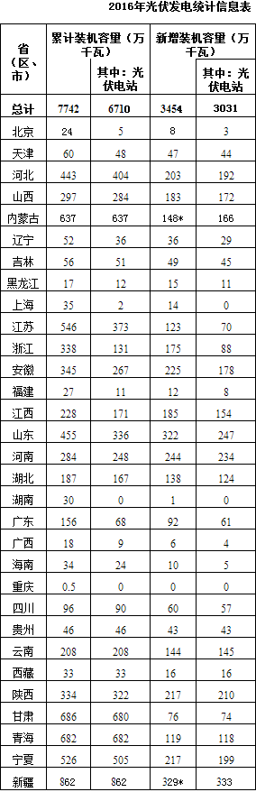 *注:2015年內(nèi)蒙古、新疆的分布式發(fā)電統(tǒng)計數(shù)據(jù)存在誤差,分別為18萬和4萬千瓦,在本表數(shù)據(jù)中進(jìn)行了相應(yīng)核減,故兩省新增裝機(jī)容量小于其光伏電站裝機(jī)容量。