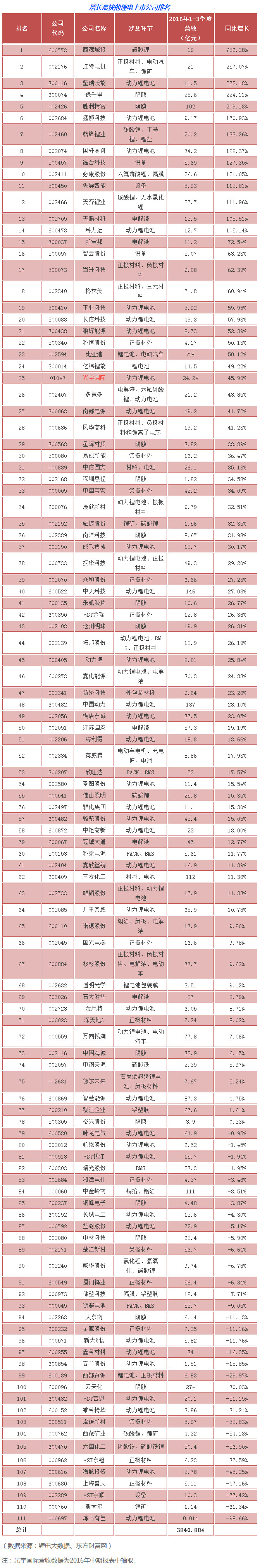 中國儲能網(wǎng)訊:據(jù)鋰電大數(shù)據(jù)統(tǒng)計,截止2016年三季度,111家中國鋰電池相關(guān)上市公司營收總和約為3840.884億元。營收同比增長排名前10的鋰電上市公司分別是西藏城投、江特電機、堅瑞沃能、保千里、勝利精密、猛獅科技、贛鋒鋰業(yè)、國軒高科、贏合科技、必康股份。